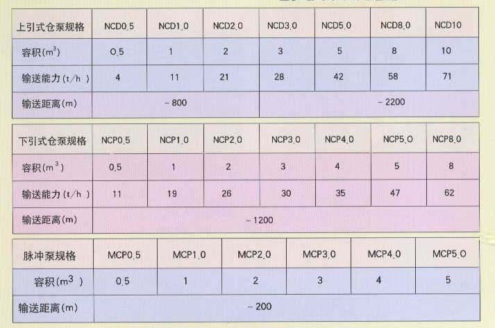 我公司生产的仓式泵输送系统,按出料口位置不同分为上引式(NCD系列)、下引式(NCP系列);按运行形式不同分为单仓泵、双仓泵两种:容积范围为0.25~10立方米,输送距离最 大2200米,输送能力最 大71吨/小时。